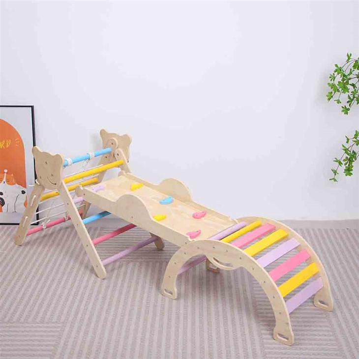 Bréagáin dreapadóireachta le triantán, sleamhnán, rampa dreapadóireachta carraige, stuáilte & clár dubh.