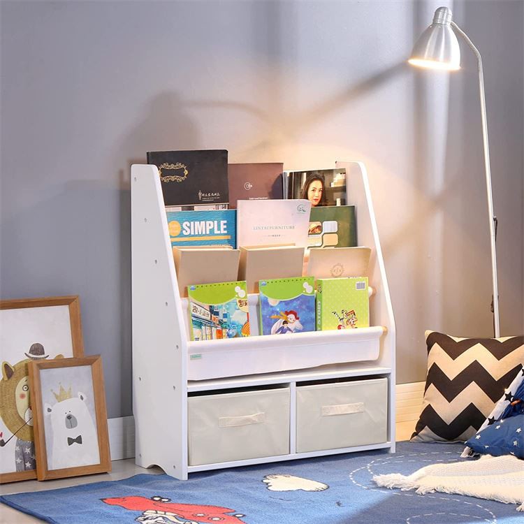 Is féidir le dearadh sábhála spáis agus uasmhéid spáis stórála, líon mór leabhar, irisí, bréagáin, srl a stóráil. Is féidir leabhair a thaispeáint ar thaobh tosaigh nó ar ais in ionad an spine, rud a fhágann go bhfuil sé éasca do leanaí leabhair a roghnú leo féin. Cothaítear scileanna eagrúcháin agus léitheoireachta do chailíní agus do bhuachaillí 3 bliana d’aois agus níos sine. Tá dearadh tógála adhmaid sturdy éasca le chéile agus glan.